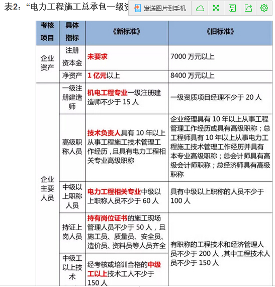 新《建筑業企業資質標準》在企業資產、企業主要人員、企業工程業績這三大方面,與《舊標準》相比,要求明顯提高。下面以電力工程施工總承包一級資質標準為例,列表說明如下: