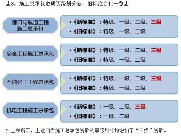 表3:施工總承包資質等級劃分新、舊標準變化一覽表