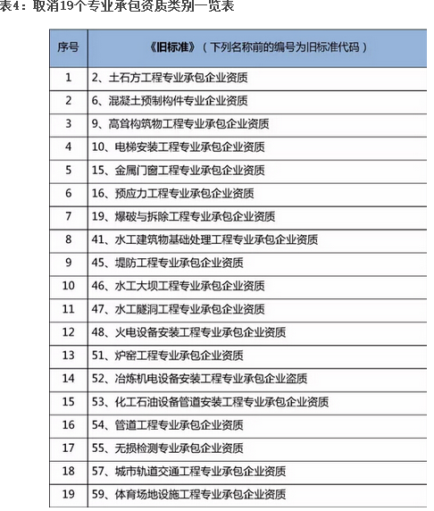 此次新《建筑業企業資質標準》對于專業承包資質的修訂變化很大,專業承包資質類別由60個減少為36個。首先,對可由市場自主選擇、行業自律進行調節或不符合現行法律法規和職能要求的19個專業承包資質予以取消;其次,對部分專業劃分過細、市場需求較少、經營業務相近的專業承包資質予以合并;最后,對9個專業承包資質類別的等級劃分進行了調整。