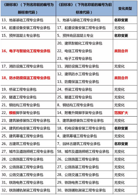 如上表所示,新《建筑業企業資質標準》中的“16、電子與智能化工程專業承包”、“18、防水防腐保溫工程專業承包”、“40、港航設備安裝及水上交管工程專業承包”三個類別是由《舊標準》中若干類別合并而成。此外,“附著升降腳手架專業承包”資質類別已擴大為“模板腳手架專業承包”。
